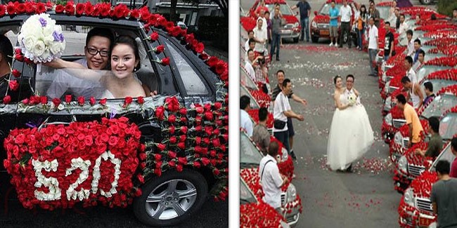 أنفق كساو وانج راتب سنة كاملة ليشتري 99.999 وردة حمراء لعروسته من أجل حفل زفافهم في شونج كينج بوسط الصين. احتاج الزوجان إلى تزيين 24 سيارة بالورود لتبلغ العدد المطلوب وقد أعلنوا على الانترنت عن حاجتهم لشركات تأجير سيارات ومتطوعين لتزيينها بعد جلبها من الطرف الآخر للبلد. قال وانج أن زوجته تحب هذه الزهور كثيراً وأن الموضوع كان يستحق المجهود المبذول فقط ليرى نظرة عينيها حينما رأت السيارات المزينة بالورود. قالت ليو زوجته أنها ذكرت له في السنة الماضية أنها تريد أن تحظى بحفل زفاف رومانسي لكنها لم تتوقع أن يتذكر ذلك، وقد تبرعت أيضاً بنسبة 20 بالمئة من تكلفة الزهور للأعمال الخيرية حتى يحالفها الحظ في زواجها.